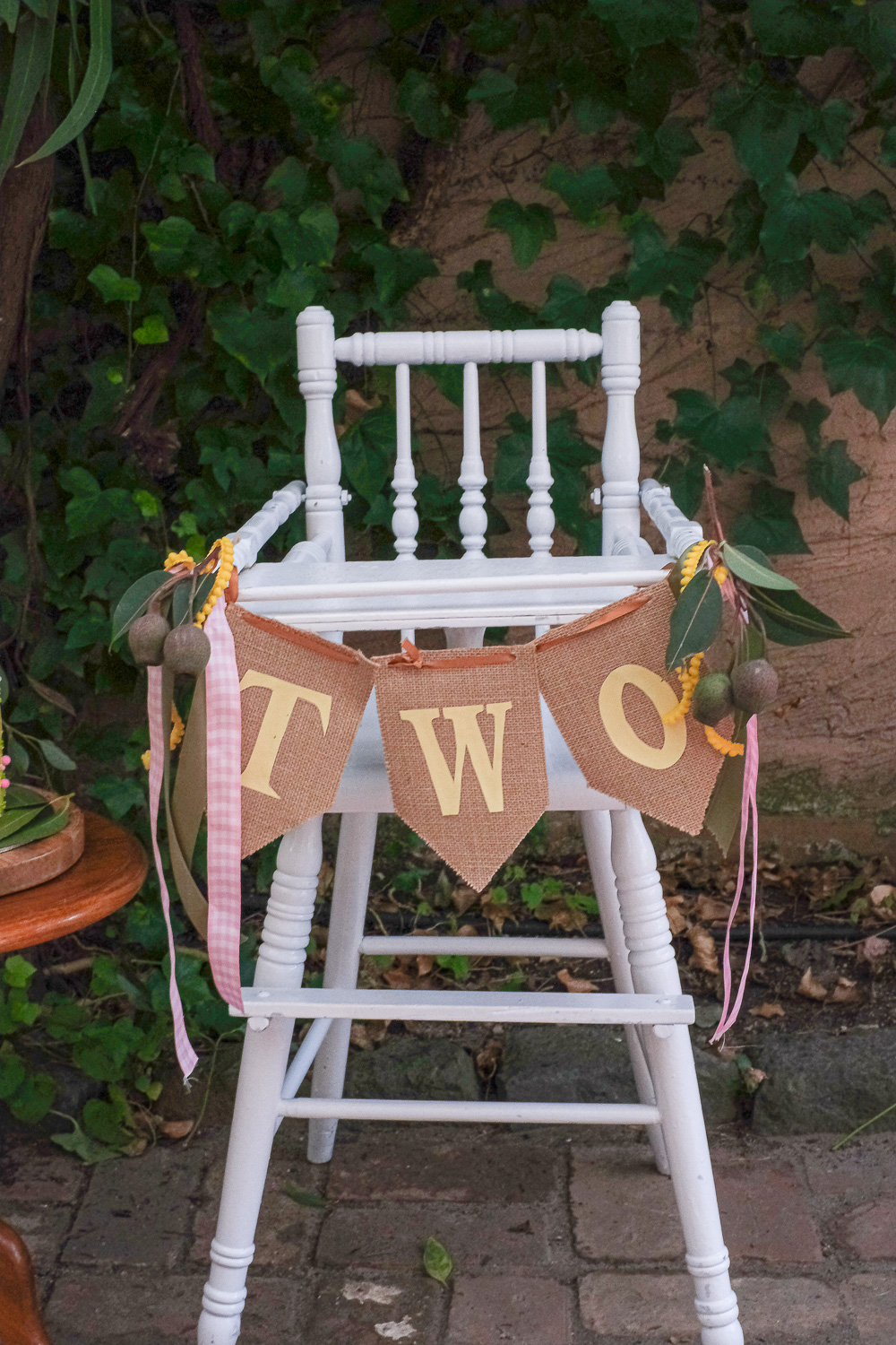 - Bunting: I made this years ago for Roo’s second birthday so just reused it. Its cut from hessian sheets and yellow card (Spotlight) and punched with a hole punch then strung with twine. I added ribbons from by sewing kit and gum nuts from a tree from across the road.